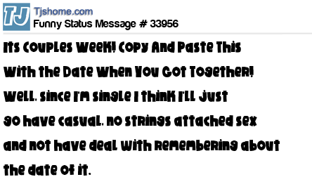 X Its Couples Week! Copy And Paste This With the Date When You Got Together! Well, since I'm single I think I'll just go have casual, no strings attached sex and not have deal with remembering about the date of it.