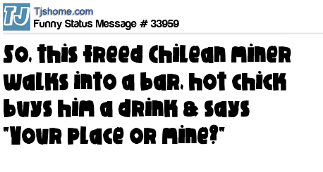 X So, this freed Chilean miner walks into a bar, hot chick buys him a drink & says "Your place or mine?"