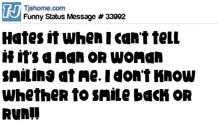X  Hates it when I can't tell if it's a man or woman smiling at me. I don't know whether to smile back or run!!