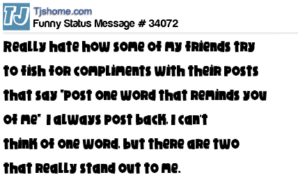 X Really hate how some of my friends try to fish for compliments with their posts that say "post one word that reminds you of me" I always post back, I can't think of one word, but there are two that really stand out to me.