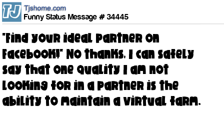 - # 34472 "Find your ideal partner on Facebook"No thanks, I can safely say that one quality I am not looking for in a partner is the ability to maintain a virtual farm.