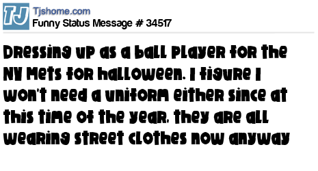 X is dressing up as a ball player for the NY Mets for halloween. I figure I won't need a uniform either since at this time of the year, they are all wearing street clothes now anyway