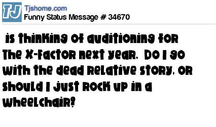 X is thinking of auditioning for The X-Factor next year. Do I go with the dead relative story, or should I just rock up in a wheelchair?