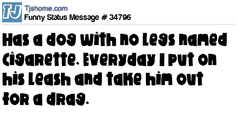 X has a dog with no legs named Cigarette. Everyday I put on his leash and take him out for a drag.