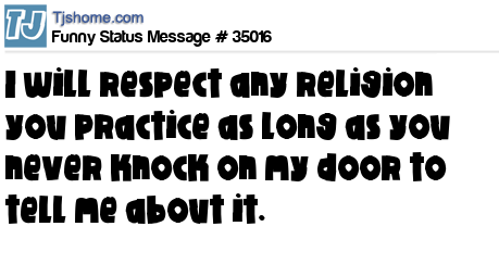 - # 52312 I will respect any religion you practice as long as you don't knock on my door and tell me about it.
