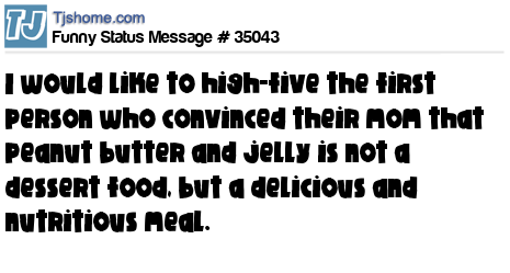 X I would like to high-five the first person who convinced their mom that peanut butter and jelly is not a dessert food, but a delicious and nutritious meal.