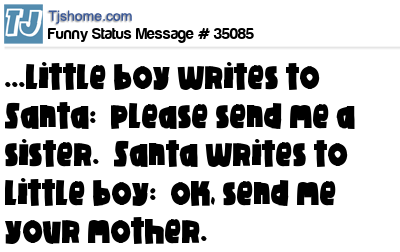 - # 40511 One day, a little boy wrote to Santa Clause, "Please send me a sister." Santa Clause wrote him back, "Ok, send me your mother."