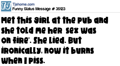 X is met this girl at the pub and she told me her ‘sex was on fire'. She lied. But ironically, now it burns when I piss.