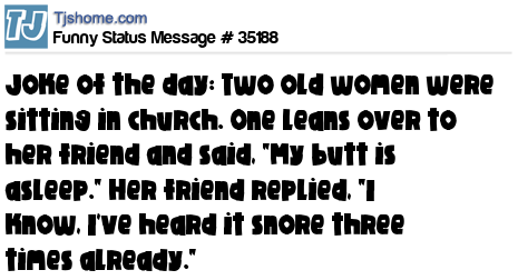 X says Joke of the day: Two old women were sitting in church. One leans over to her friend and said, "My butt is asleep." Her friend replied, "I know, I've heard it snore three times already."