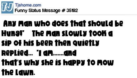 X is Any man who does that should be Hung!" The man slowly took a sip of his beer then quietly replied... "I am,......and that's why she is happy to mow the lawn.