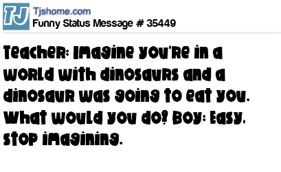- # 70645 Teacher: Imagine you were in a world of dinosaurs and they were about to eat you. What would you do? Smart-a$$ Student: Easy, stop imagining.