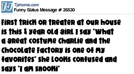 X First trick or treater at our house is this 5 year old girl I say "What a great costume Charlie and the Chocolate Factory is one of my favorites" she looks confused and says "I am snooki"