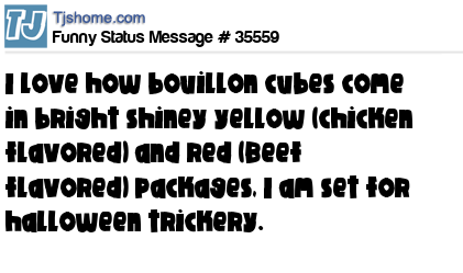 X is I love how bouillon cubes come in bright shiney yellow (chicken flavored) and red (Beef flavored) packages, I am set for halloween trickery.