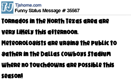 X says Tornados in the North Texas area are very likely this afternoon. Meteorologists are urging the public to gather in the Dallas Cowboys Stadium where no touchdowns are possible this season!
