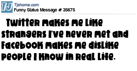 - # 59772 Twitter makes me love people I've never met and Facebook makes me hate people I know in real life.