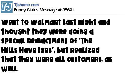 X Went to Walmart last night and thought they were doing a special reinactment of "The Hills Have Eyes", but realized that they were all customers, as well.