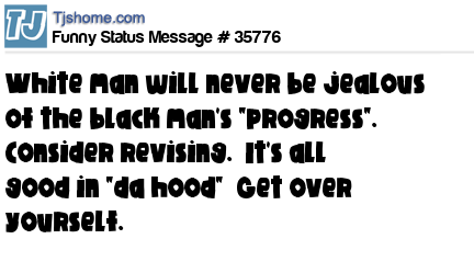 X is white man will never be jealous of the black man's "progress".  Consider revising.  It's all good in "da hood"  Get over yourself.