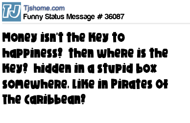 X is money isn't the key to happiness? then where is the key? hidden in a stupid box somewhere, like in Pirates Of The Caribbean?