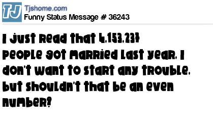 - # 166281 Just read that 4,153,237 people got married last year, not to cause any trouble but shouldn't that be an even number?