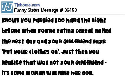 X knows you partied too hard the night before when you're eating cereal naked the next day and your girlfriend says: "Put your clothes on". Just then you realize that was not your girlfriend - it's some woman walking her dog.
