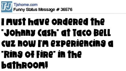 X is I must have ordered the "Johnny Cash" at Taco Bell cuz now I'm experiencing a "Ring of Fire" in the bathroom!
