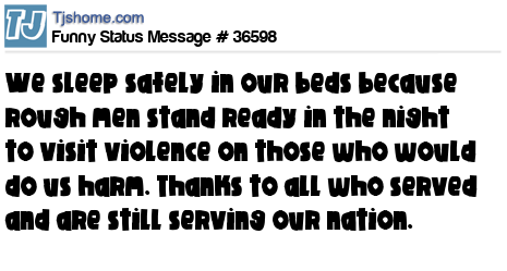X We sleep safely in our beds because rough men stand ready in the night to visit violence on those who would do us harm. Thanks to all who served and are still serving our nation.