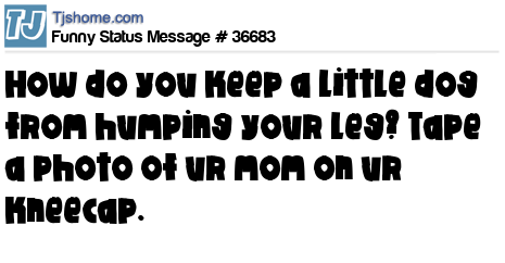 X how do you keep a little dog from humping your leg? Tape a photo of ur mom on ur kneecap.
