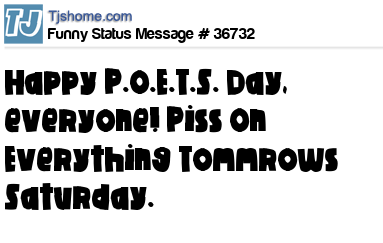 X says happy P.O.E.T.S. Day, everyone! Piss On Everything Tommrows Saturday.