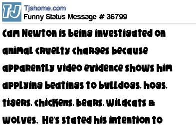 X Cam Newton is being investigated on animal cruelty charges because apparently video evidence shows him applying beatings to bulldogs, hogs, tigers, chickens, bears, wildcats & wolves. He's stated his intention to beat elephants, ducks & dawgs soon...