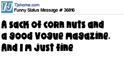 X says A sack of corn nuts and a good Vogue magazine. And I m just fine