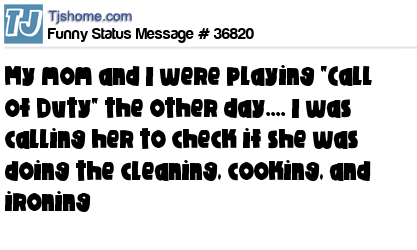 X My mom and I were playing "Call of Duty" the other day.... I was calling her to check if she was doing the cleaning, cooking, and ironing