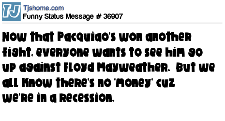 X Now that Pacquiao's won another fight, everyone wants to see him go up against Floyd Mayweather. But we all know there's no 'money' cuz we're in a recession.