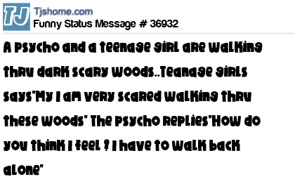 X is A psycho and a teenage girl are walking thru dark scary woods..Teanage girls says"My I am very scared walking thru these woods" The psycho replies"How do you think I feel ? I have to walk back alone"