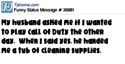- # 36820 My mom and I were playing "Call of Duty" the other day.... I was calling her to check if she was doing the cleaning, cooking, and ironing
