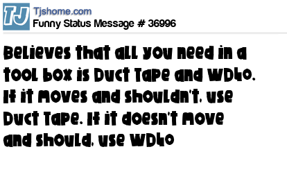 X is believes that all you need in a tool box is Duct Tape and WD40. If it moves and shouldn't, use Duct Tape. If it doesn't move and should, use WD40