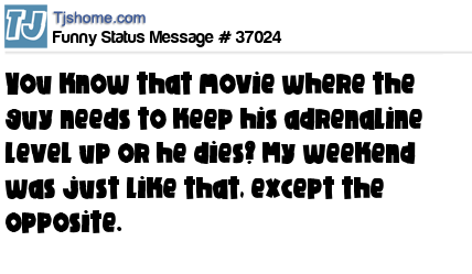 X You know that movie where the guy needs to keep his adrenaline level up or he dies? My weekend was just like that, except the opposite.