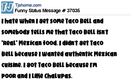 X I hate when I get some Taco Bell and somebody tells me that Taco Bell isn't "real" Mexican food. I didn't get Taco Bell because I wanted authentic Mexican cuisine. I got Taco Bell because I'm poor and I like Chalupas.