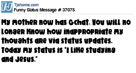 X My mother now has Gchat. You will no longer know how inappropriate my thoughts are via status updates. Today my status is "I like studying and Jesus."