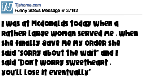 - # 31080 A fat chick served me at McDonalds earlier. She said, "Sorry about the wait". I said, "Don't worry darl, you'll lose it eventually".