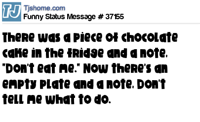 - # 32398 There was a piece of chocolate cake in the fridge and a note, "Don't eat me." Now there's an empty plate and a note, "Don't tell me what to do."