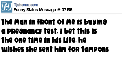 - # 78164 The man in front of me is buying a pregnancy test. I think this is the one time in his life, where he wishes she sent him for tampons!
