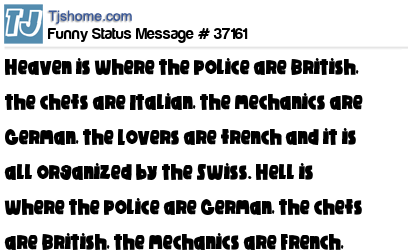 - # 40375 "Heaven is where the Police are British, the Chefs are French, the Mechanics are German, the Lovers Italian and it's all organised by the Swiss.