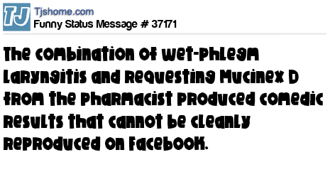 X The combination of wet-phlegm laryngitis and requesting Mucinex D from the pharmacist produced comedic results that cannot be cleanly reproduced on Facebook.