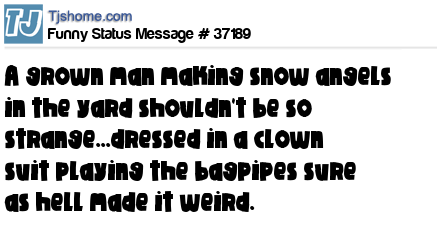 X is A grown man making snow angels in the yard shouldn't be so strange...dressed in a clown suit playing the bagpipes sure as hell made it weird.