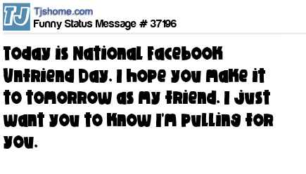 X Today is National Facebook Unfriend Day. I hope you make it to tomorrow as my friend. I just want you to know I'm pulling for you.