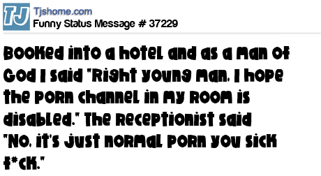 X Booked into a hotel and as a man of God I said "Right young man, I hope the porn channel in my room is disabled." The receptionist said "No, it's just normal porn you sick f*ck."