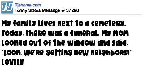 X says My family lives next to a cemetery. Today, there was a funeral. My mom looked out of the window and said, "Look, we're getting new neighbors!" LOVELY