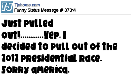 X Just pulled out!...........Yep, I decided to pull out of the 2012 presidential race. Sorry america.