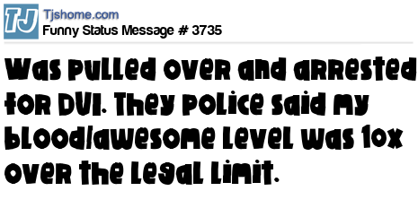 - # 42203 I just pulled up beside a police car on the highway and waved frantically for him to pull off to the side. When he did, I walked up slowly to his window and said, "Do you know why I pulled you over today, sir?" He didn't find it as amusing as me.......