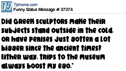 X Did Greek sculptors make their subjects stand outside in the cold, or have penises just gotten a lot bigger since the ancient times? Either way, trips to the museum always boost my ego."